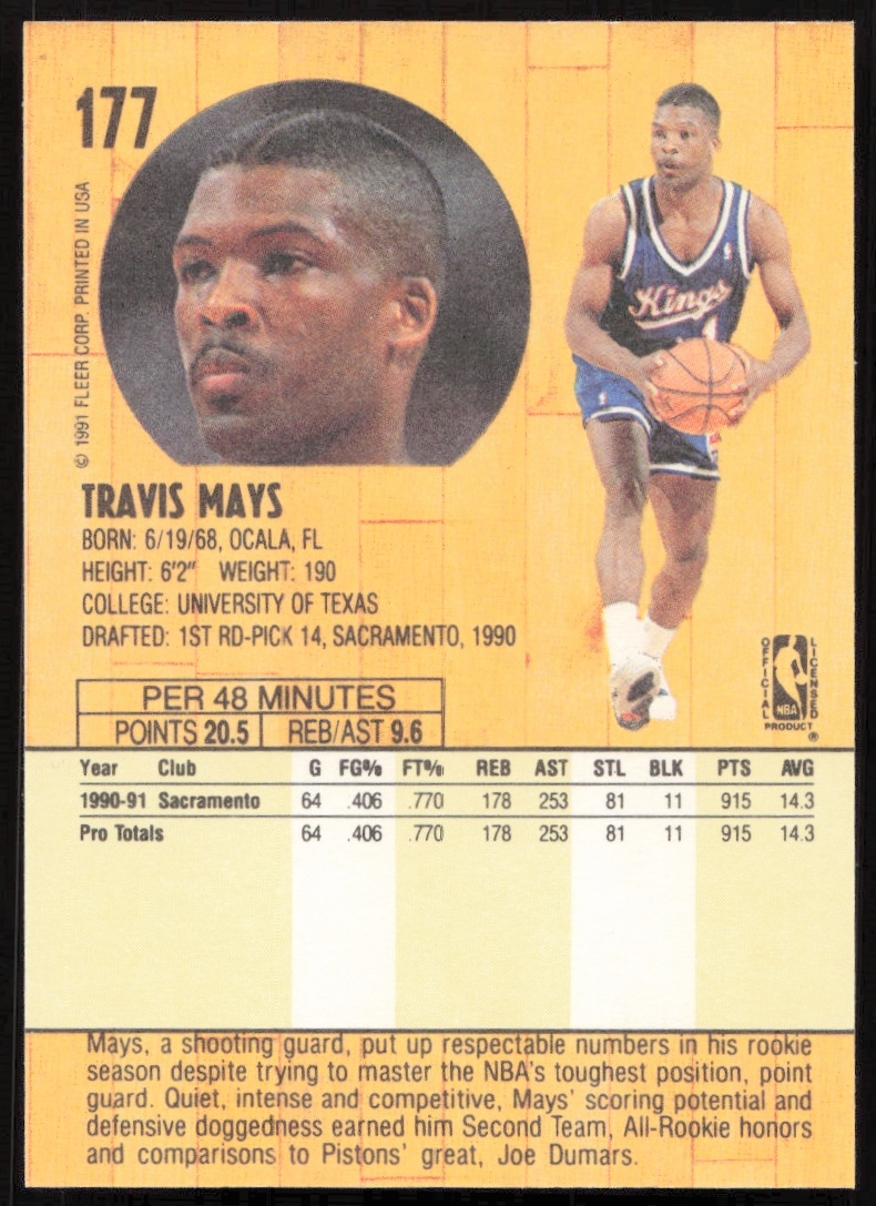 This Basketball card, from 1991 is part of the Fleer card set. Travis Mays is featured and has a card number of 177.