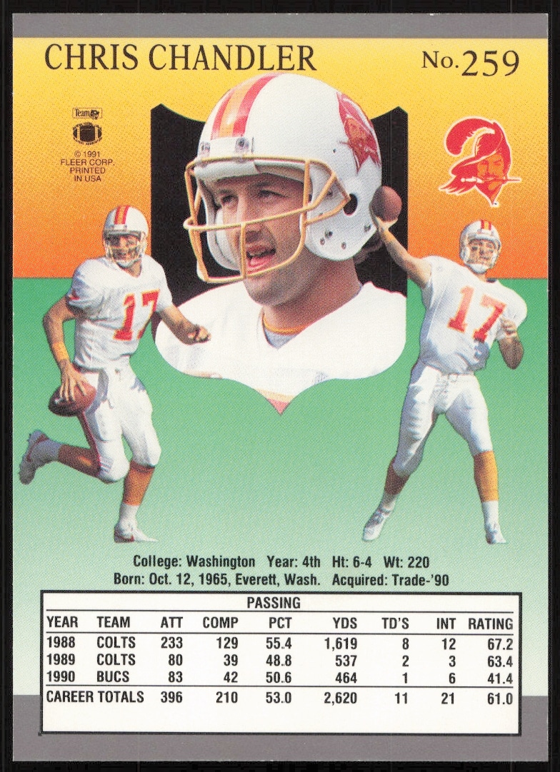 This Football card, from 1991 is part of the Fleer Ultra card set. Chris Chandler is featured and has a card number of 259.