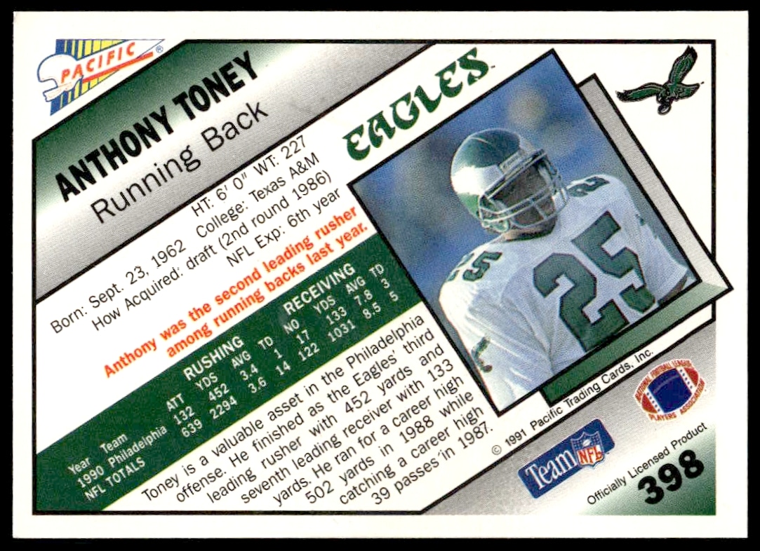 This Football card, from 1991 is part of the Pacific card set. Anthony Toney is featured and has a card number of 398.