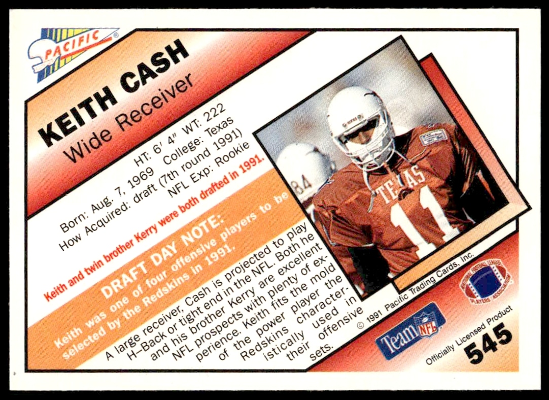 This Football card, from 1991 is part of the Pacific card set. Keith Cash is featured and has a card number of 545.