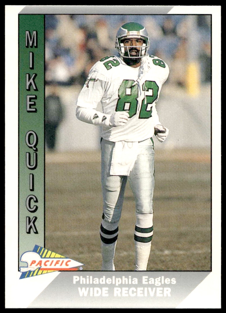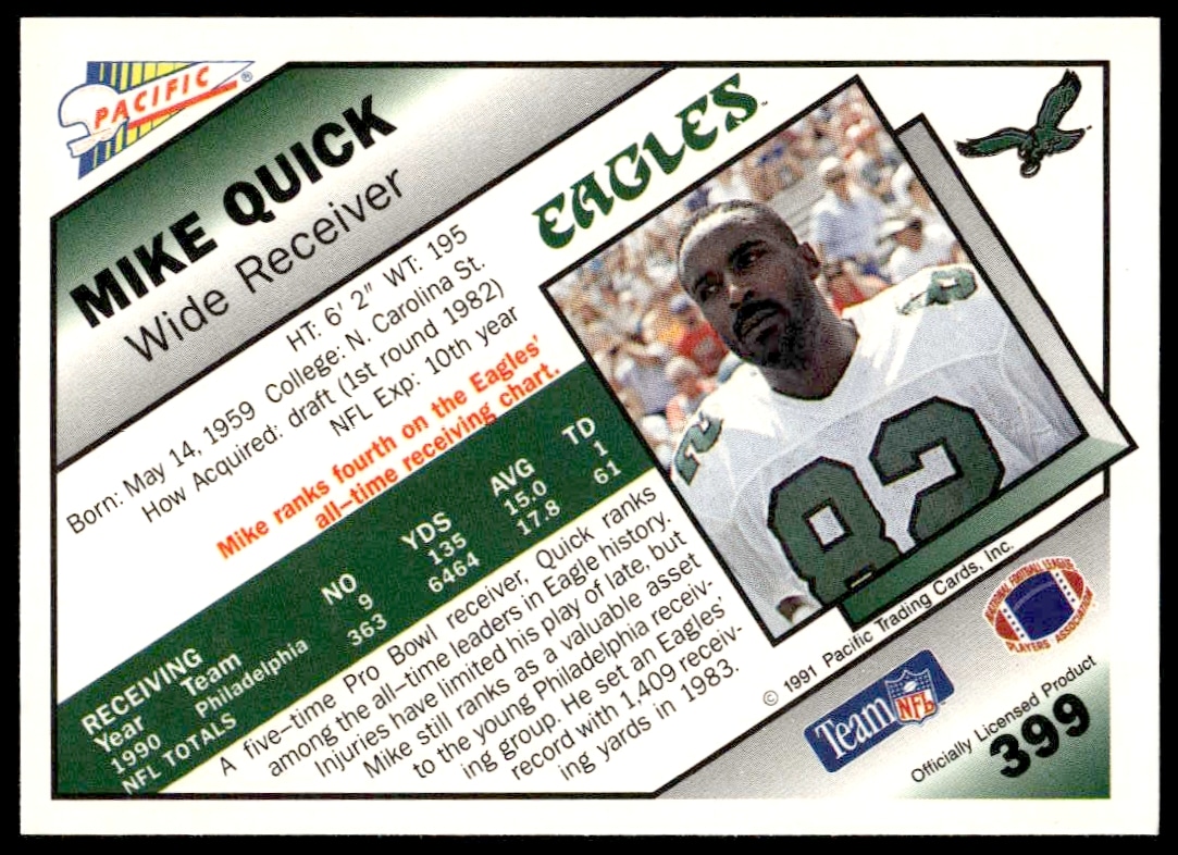This Football card, from 1991 is part of the Pacific card set. Mike Quick is featured and has a card number of 399.
