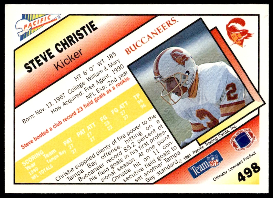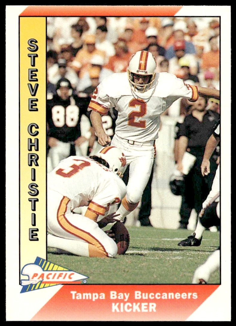 This Football card, from 1991 is part of the Pacific card set. Steve Christie is featured and has a card number of 151.