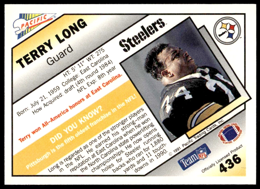 This Football card, from 1991 is part of the Pacific card set. Terry Long is featured and has a card number of 436.