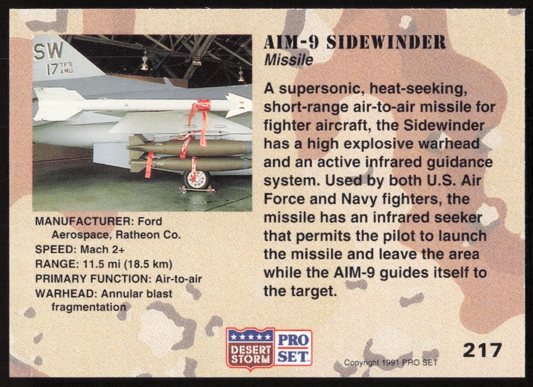 This Military card, from 1991 is part of the Pro Set Desert Storm card set. AIM-9 Sidewinder is featured and has a card number of 217.