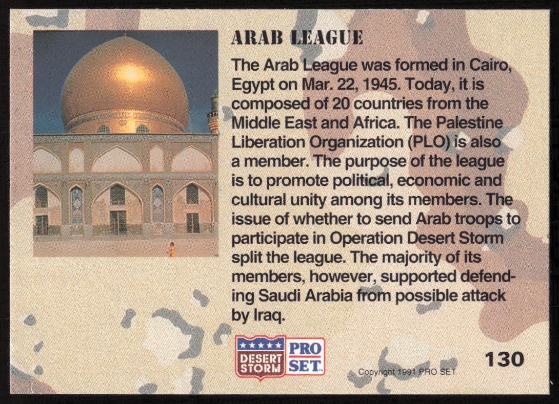 This Military card, from 1991 is part of the Pro Set Desert Storm card set. Arab League is featured and has a card number of 130.