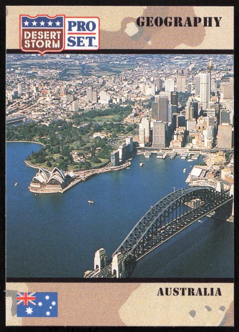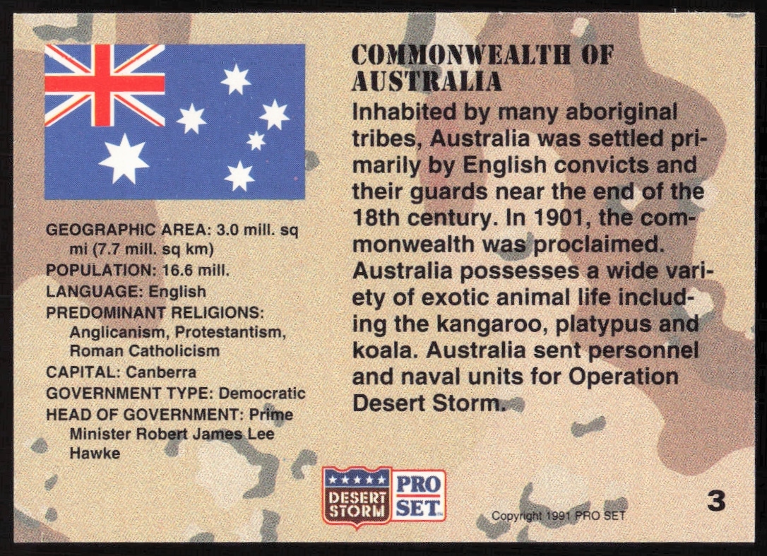 This Military card, from 1991 is part of the Pro Set Desert Storm card set. Australia is featured and has a card number of 3.