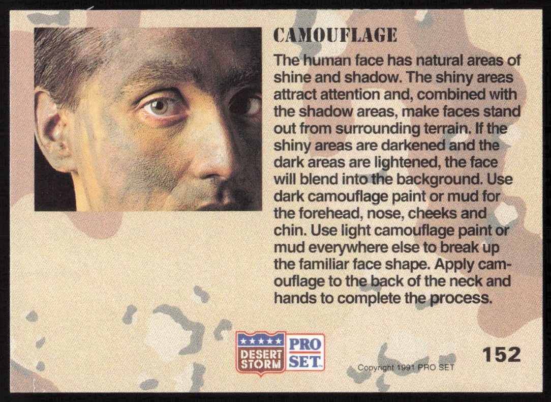 This Military card, from 1991 is part of the Pro Set Desert Storm card set. Camouflage is featured and has a card number of 152.