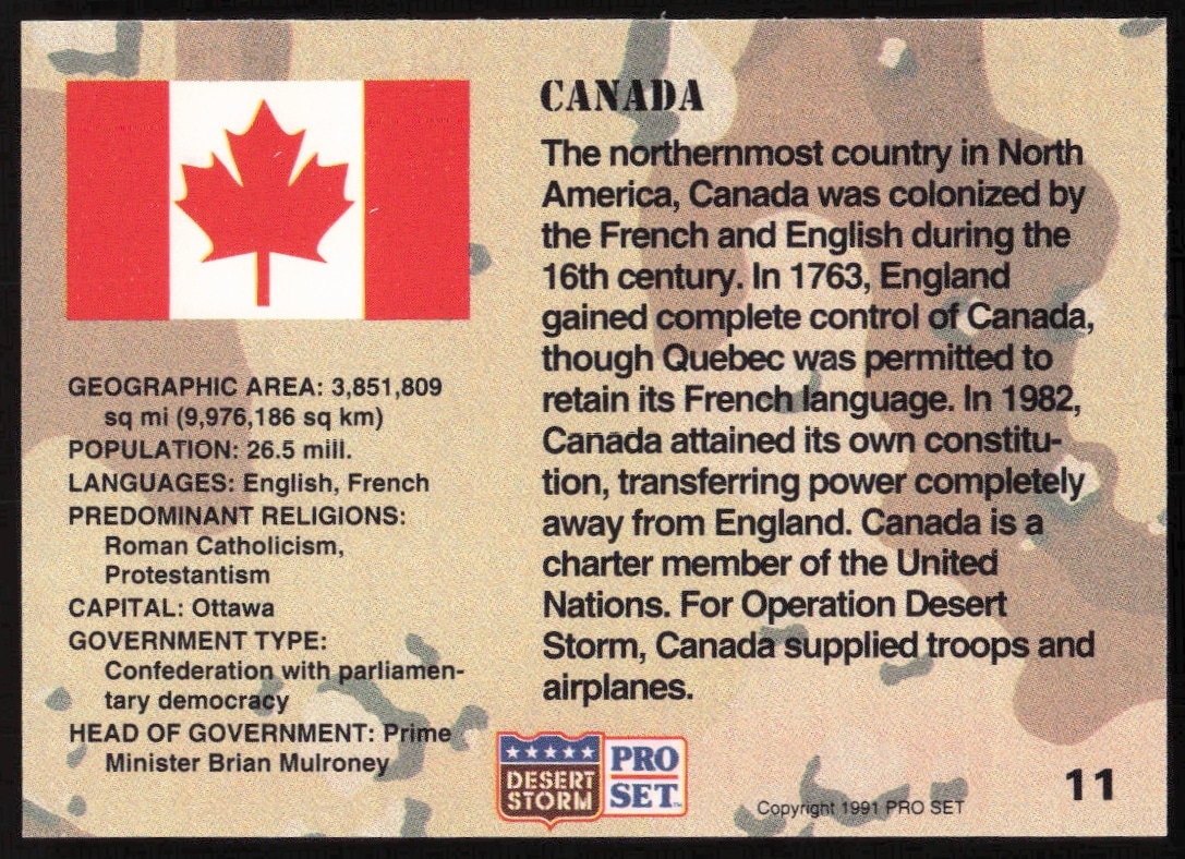 This Military card, from 1991 is part of the Pro Set Desert Storm card set. Canada is featured and has a card number of 11.