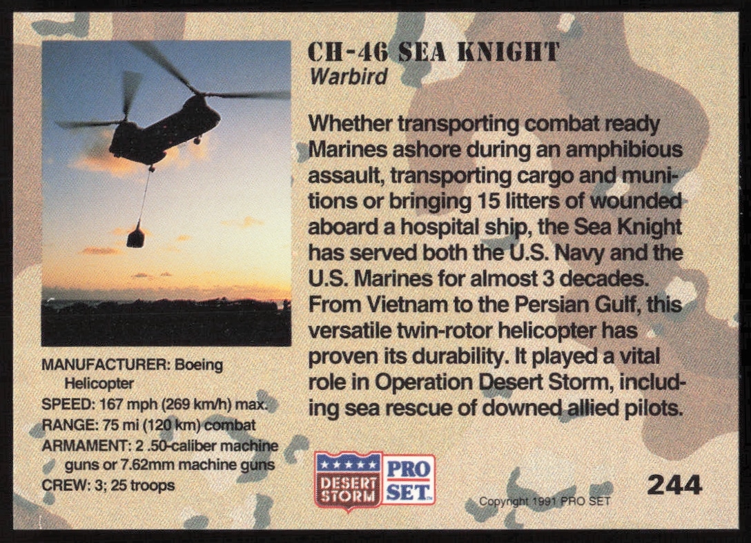 This Military card, from 1991 is part of the Pro Set Desert Storm card set. CH-46 Sea Knight is featured and has a card number of 244.