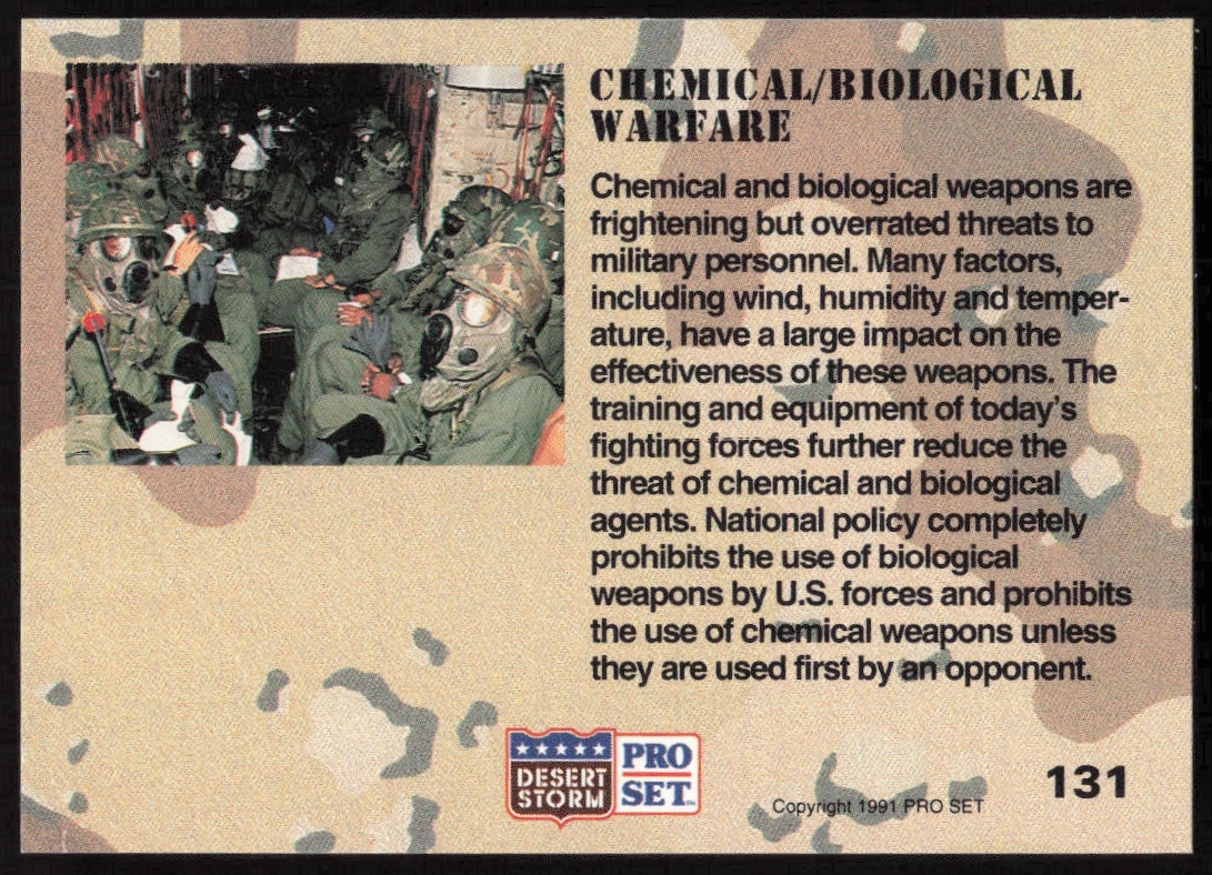 This Military card, from 1991 is part of the Pro Set Desert Storm card set. Chemical/Biological Warfare is featured and has a card number of 131.