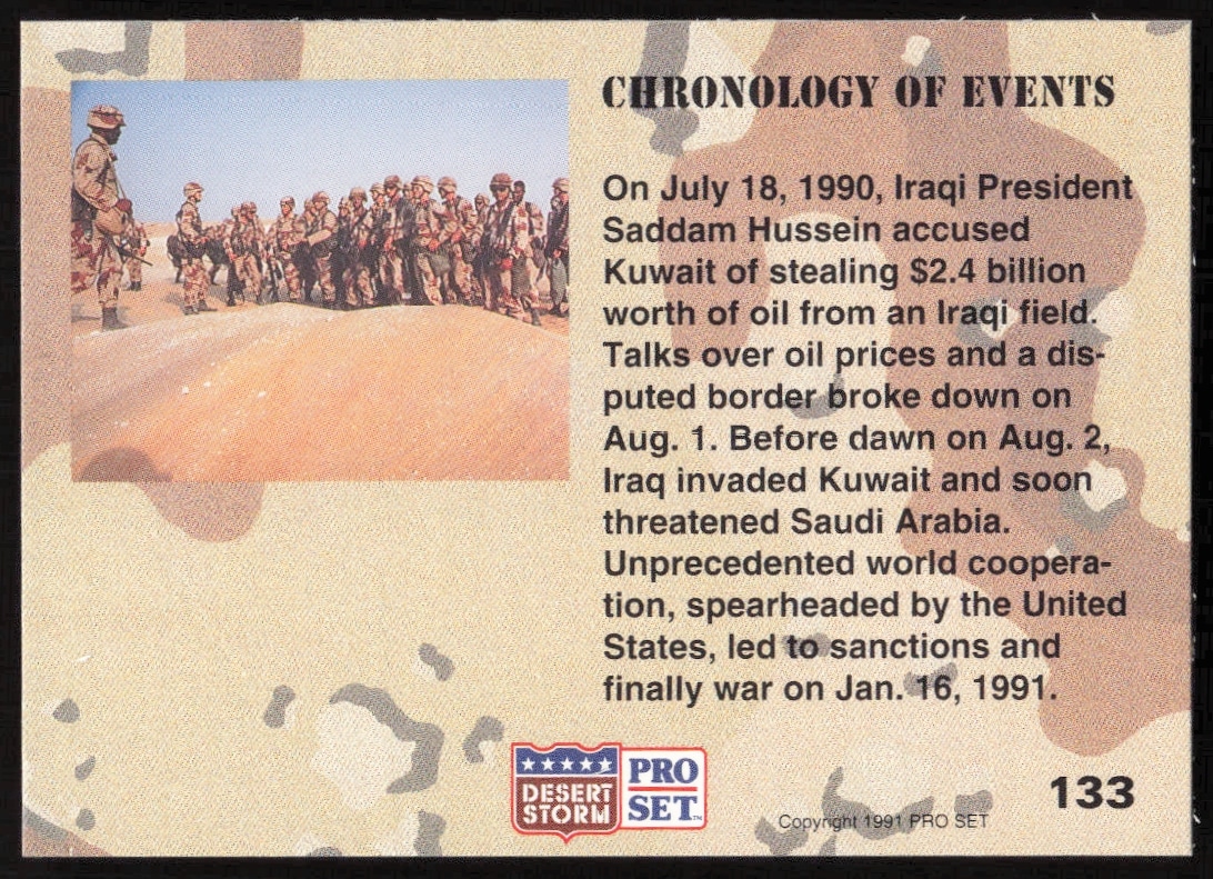 This Military card, from 1991 is part of the Pro Set Desert Storm card set. Choronology Of Events is featured and has a card number of 133.