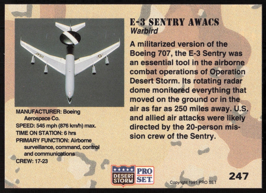 This Military card, from 1991 is part of the Pro Set Desert Storm card set. E-3 Sentry Awacs is featured and has a card number of 247.