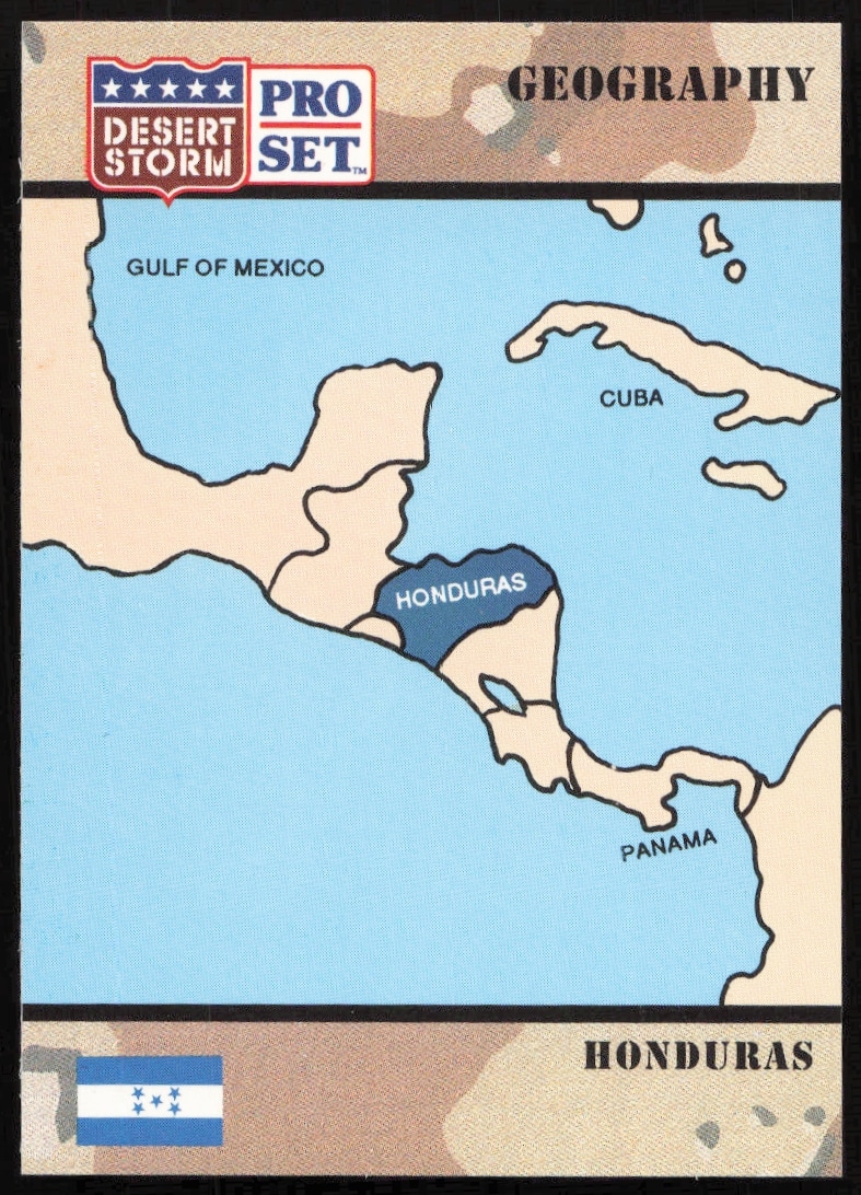 This Military card, from 1991 is part of the Pro Set Desert Storm card set. Honduras is featured and has a card number of 21.