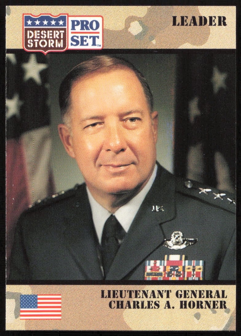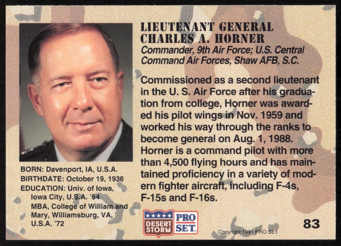 This Military card, from 1991 is part of the Pro Set Desert Storm card set. Lieutenant General Charles A. Horner is featured and has a card number of 83.