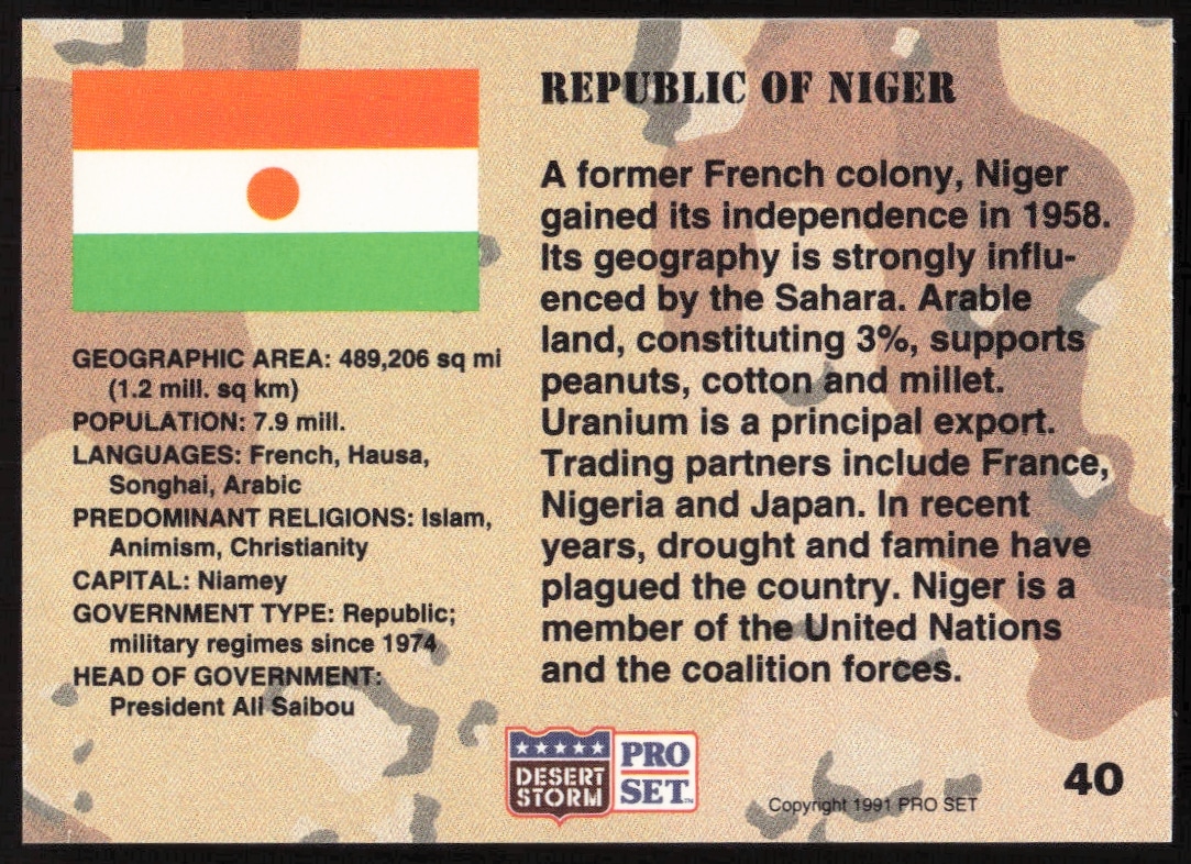 This Military card, from 1991 is part of the Pro Set Desert Storm card set. Niger is featured and has a card number of 40.
