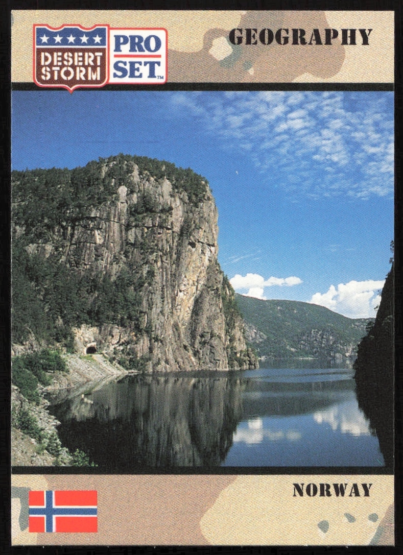 This Military card, from 1991 is part of the Pro Set Desert Storm card set. Norway is featured and has a card number of 41.