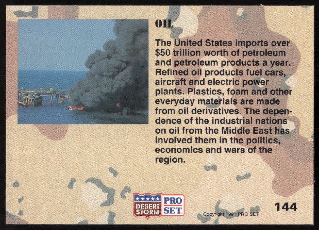 This Military card, from 1991 is part of the Pro Set Desert Storm card set. Oil is featured and has a card number of 144.