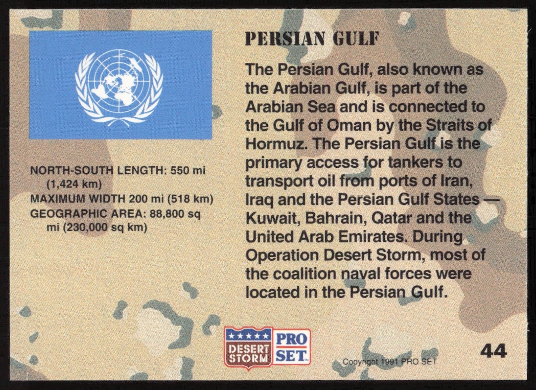 This Military card, from 1991 is part of the Pro Set Desert Storm card set. Persian Gulf is featured and has a card number of 44.