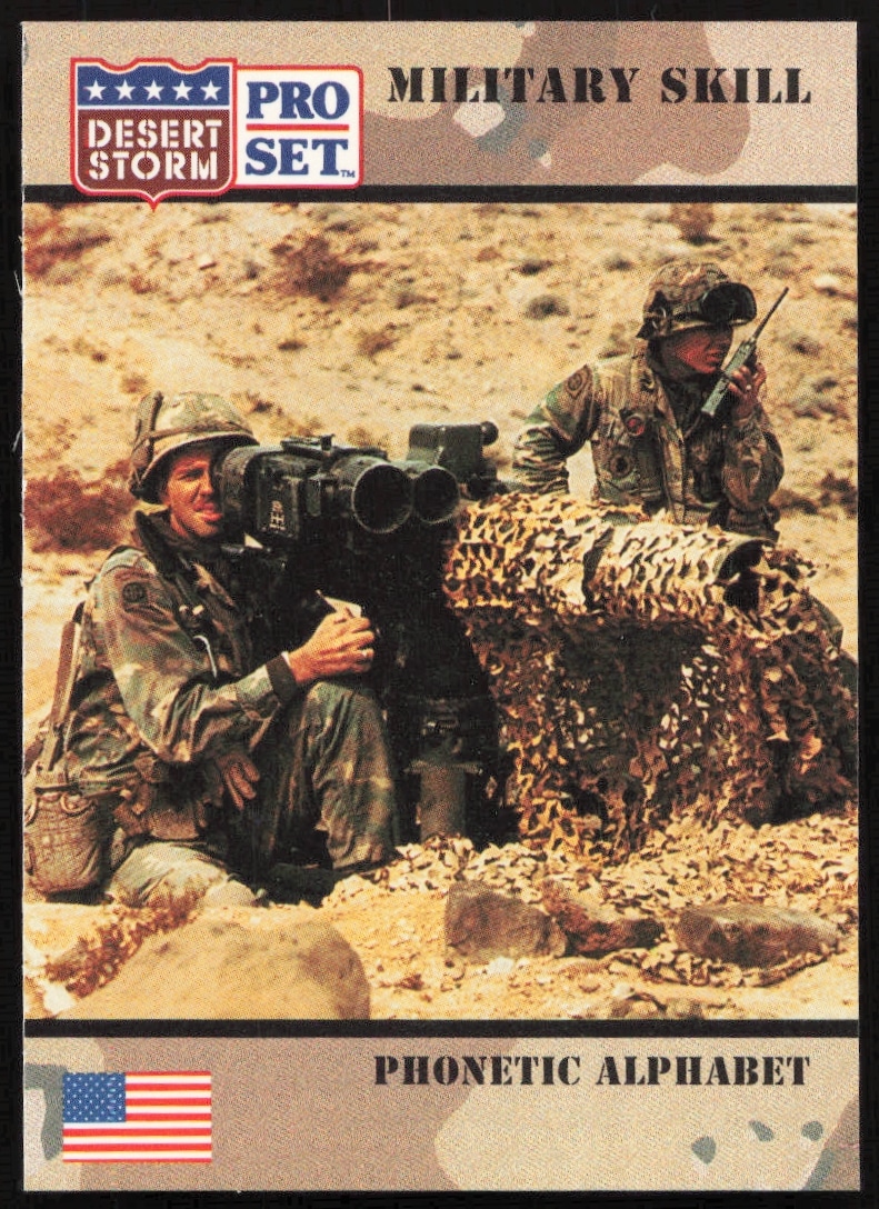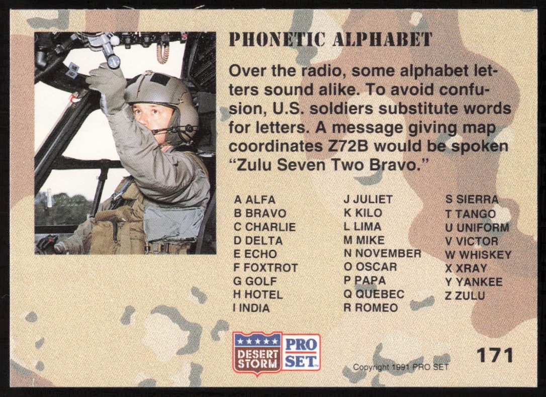 This Military card, from 1991 is part of the Pro Set Desert Storm card set. Phonetic Alphabet is featured and has a card number of 171.