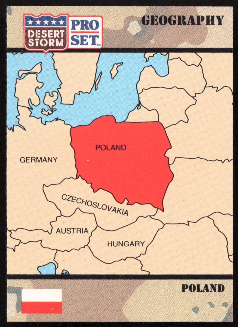 This Military card, from 1991 is part of the Pro Set Desert Storm card set. Poland is featured and has a card number of 46.
