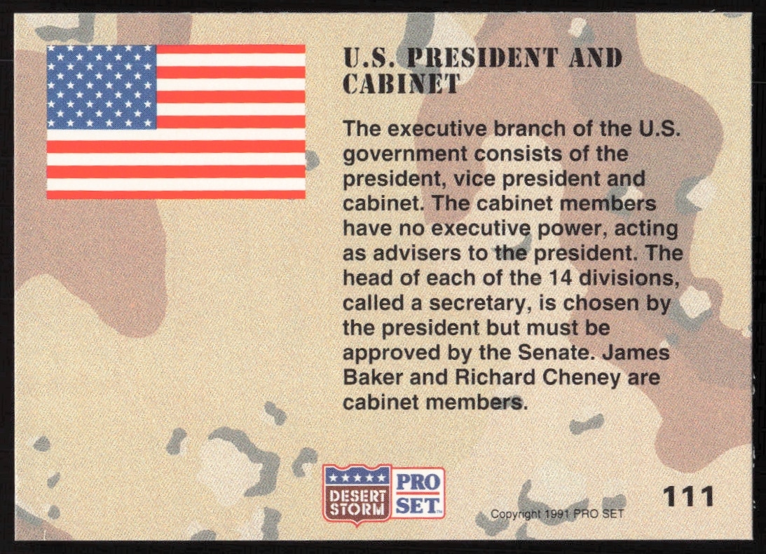 This Military card, from 1991 is part of the Pro Set Desert Storm card set. President And Cabinet is featured and has a card number of 111.