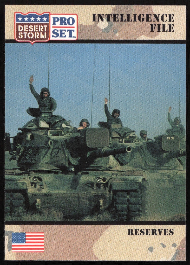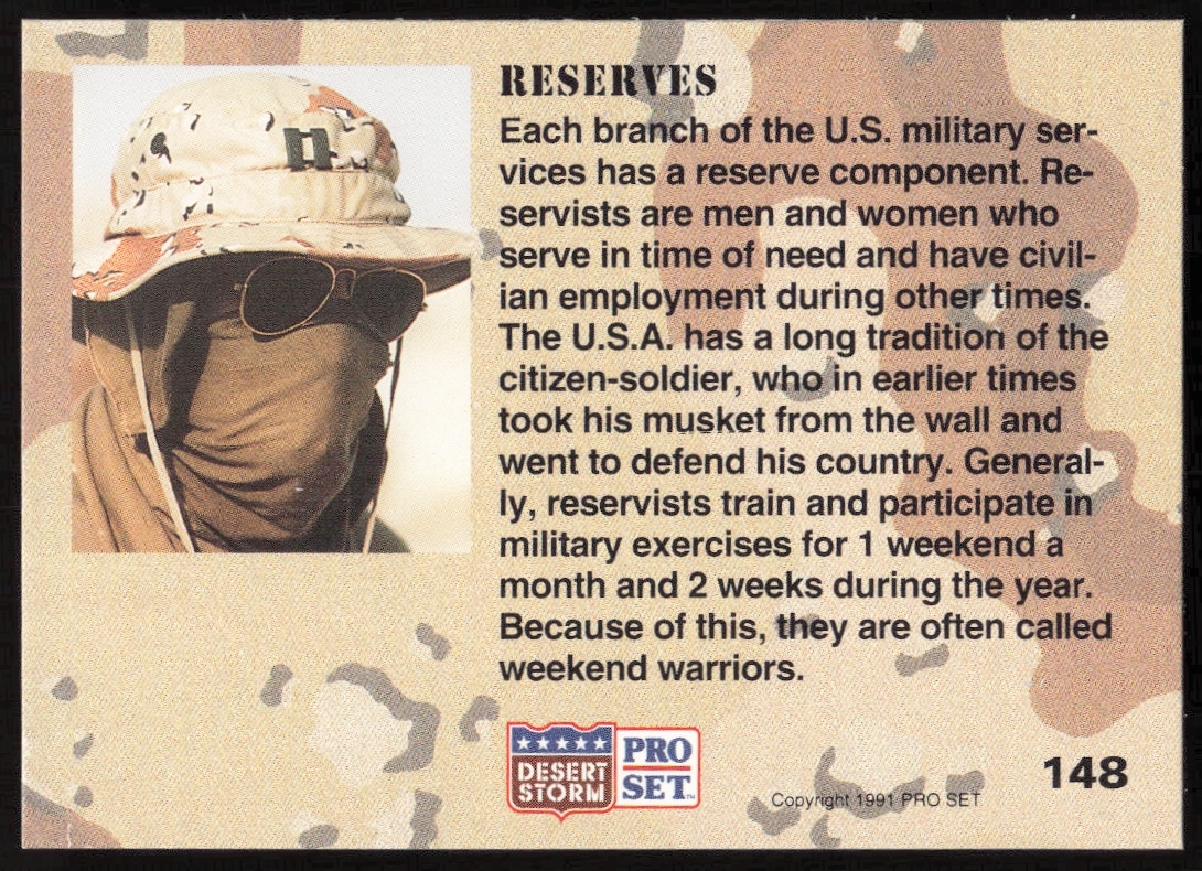 This Military card, from 1991 is part of the Pro Set Desert Storm card set. Reserves is featured and has a card number of 148.