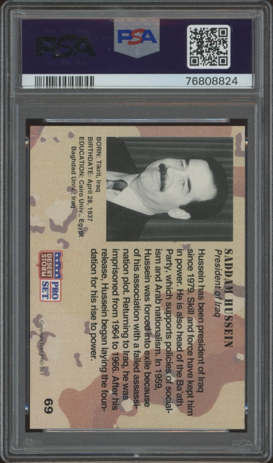 This Military card, from 1991 is part of the Pro Set Desert Storm card set. Saddam Hussein is featured and has a card number of 69. It is graded by PSA and has a numeric grade of 9.