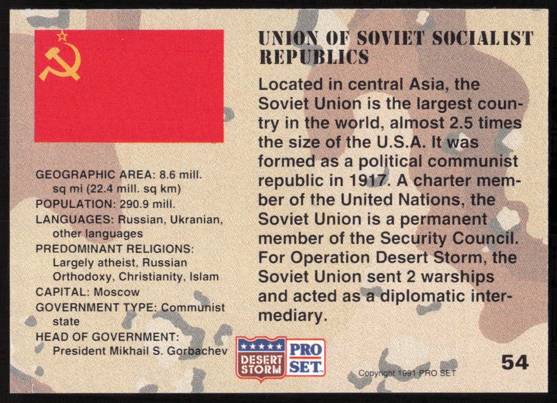 This Military card, from 1991 is part of the Pro Set Desert Storm card set. Soviet Union is featured and has a card number of 54.