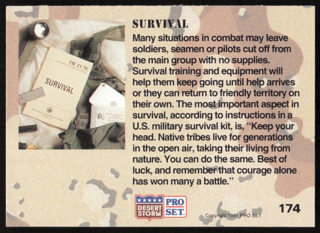 This Military card, from 1991 is part of the Pro Set Desert Storm card set. Survival is featured and has a card number of 174.
