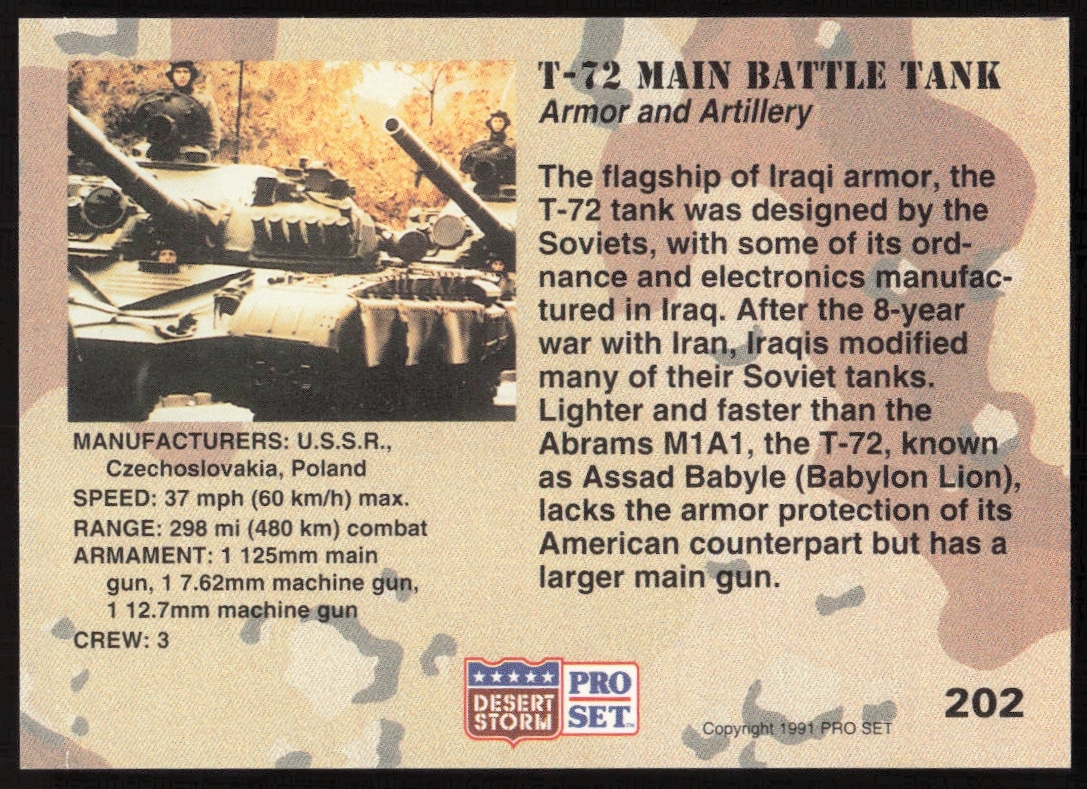 This Military card, from 1991 is part of the Pro Set Desert Storm card set. T-72 Main Battle tank is featured and has a card number of 202.