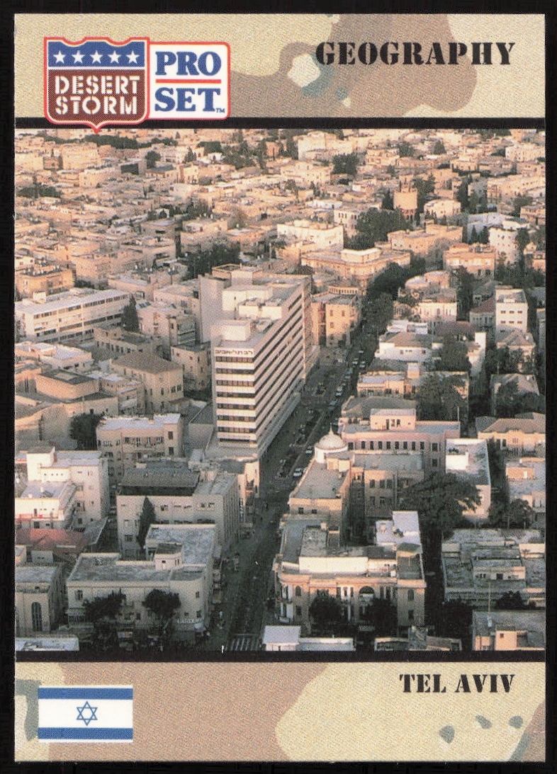 This Military card, from 1991 is part of the Pro Set Desert Storm card set. Tel Aviv is featured and has a card number of 59.