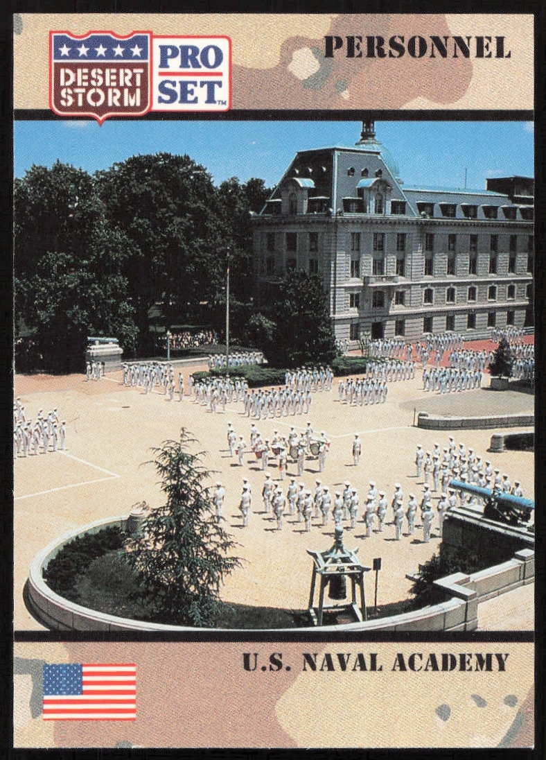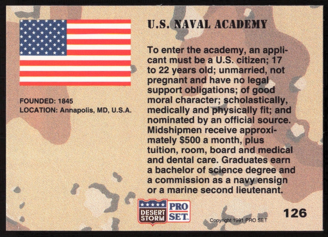 This Military card, from 1991 is part of the Pro Set Desert Storm card set. U.S Naval Academy is featured and has a card number of 126.