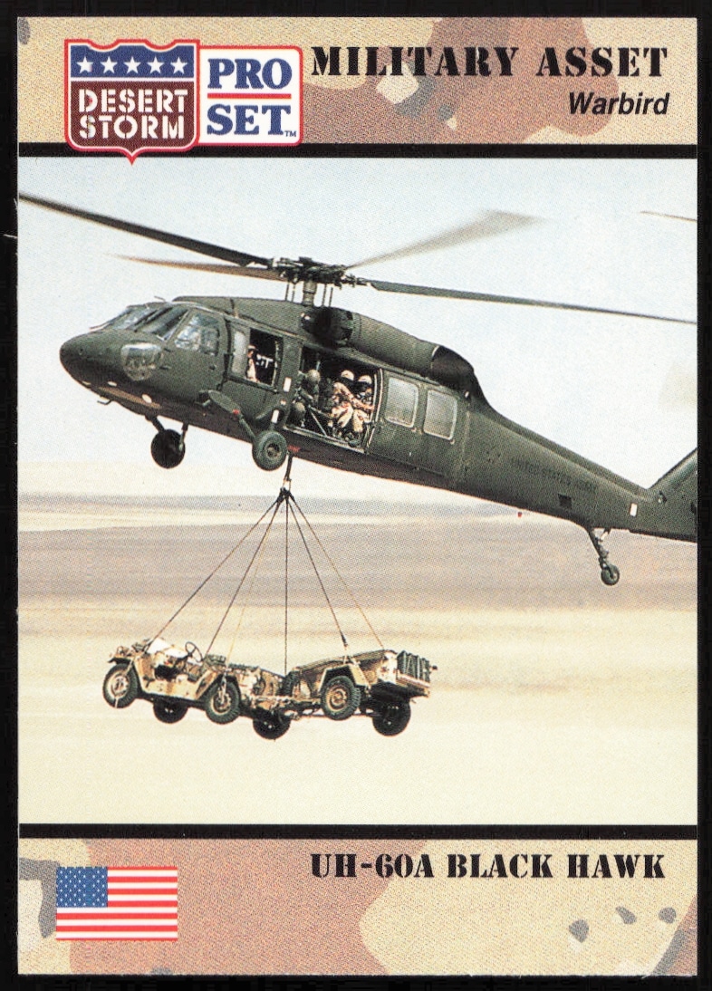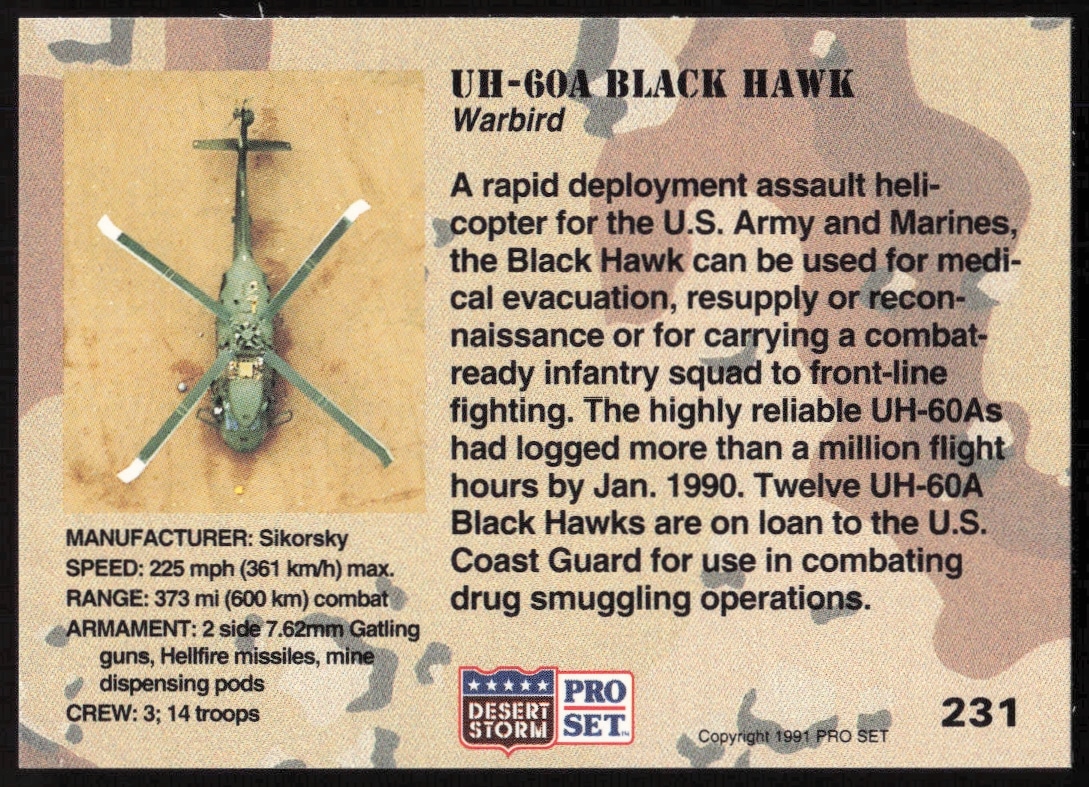 This Military card, from 1991 is part of the Pro Set Desert Storm card set. UH-60A Black Hawk is featured and has a card number of 231.