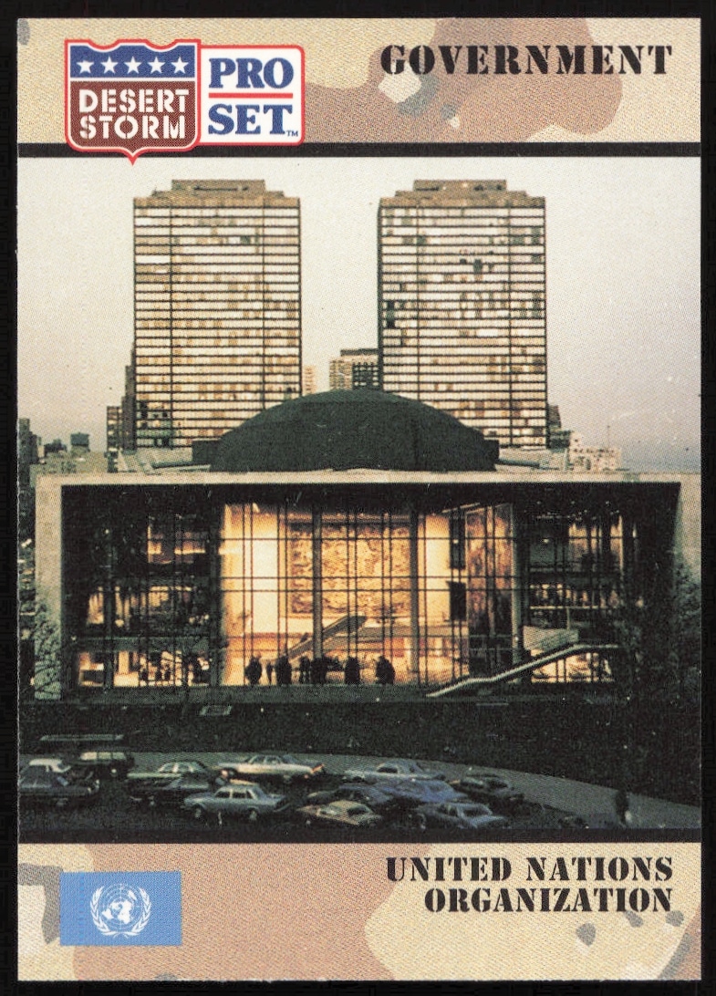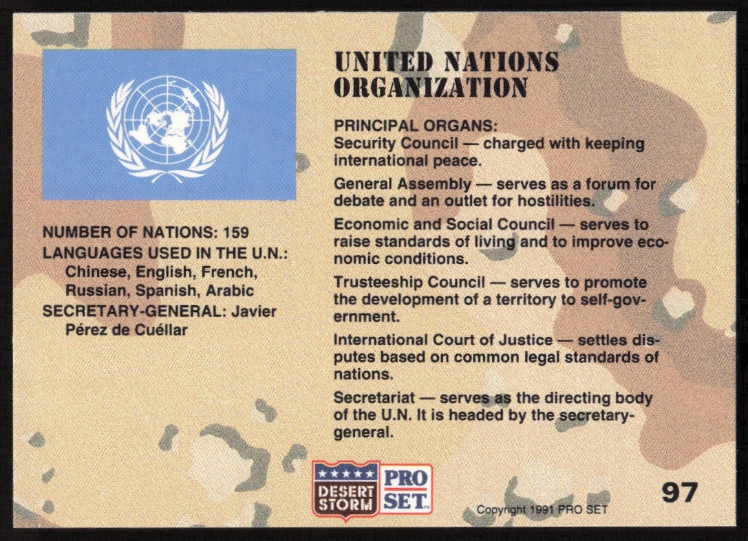 This Military card, from 1991 is part of the Pro Set Desert Storm card set. United Nations Organization is featured and has a card number of 97.