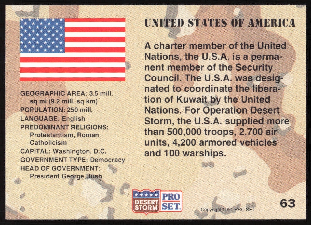 This Military card, from 1991 is part of the Pro Set Desert Storm card set. United States is featured and has a card number of 63.