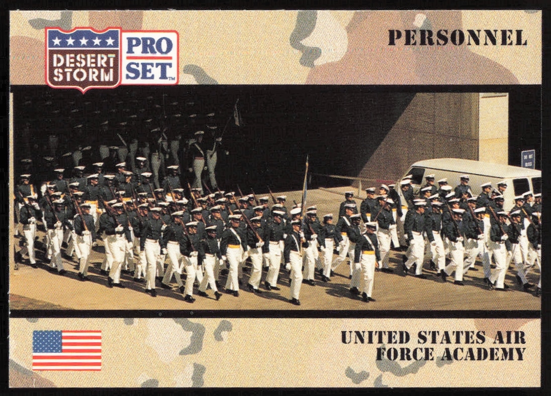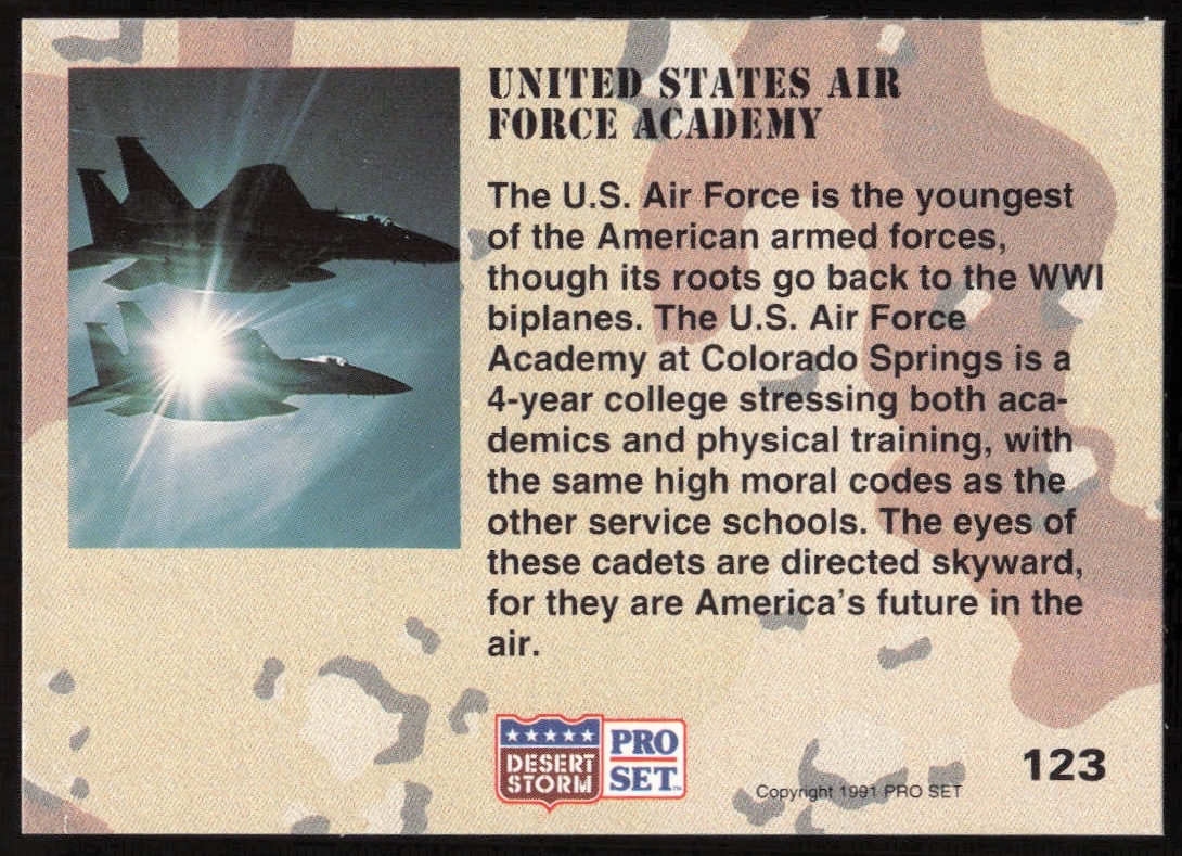 This Military card, from 1991 is part of the Pro Set Desert Storm card set. United States Air Force Academy is featured and has a card number of 123.