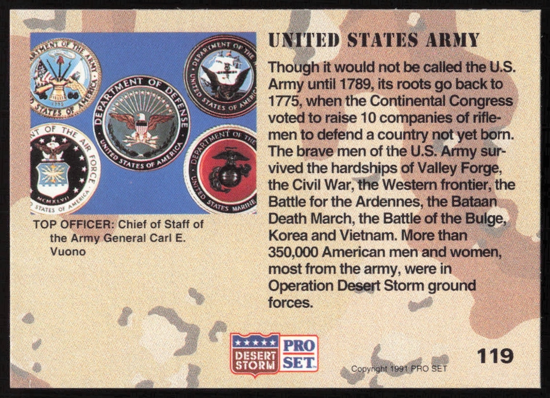 This Military card, from 1991 is part of the Pro Set Desert Storm card set. United States Army is featured and has a card number of 119.