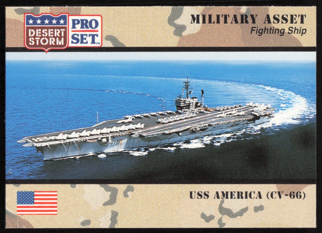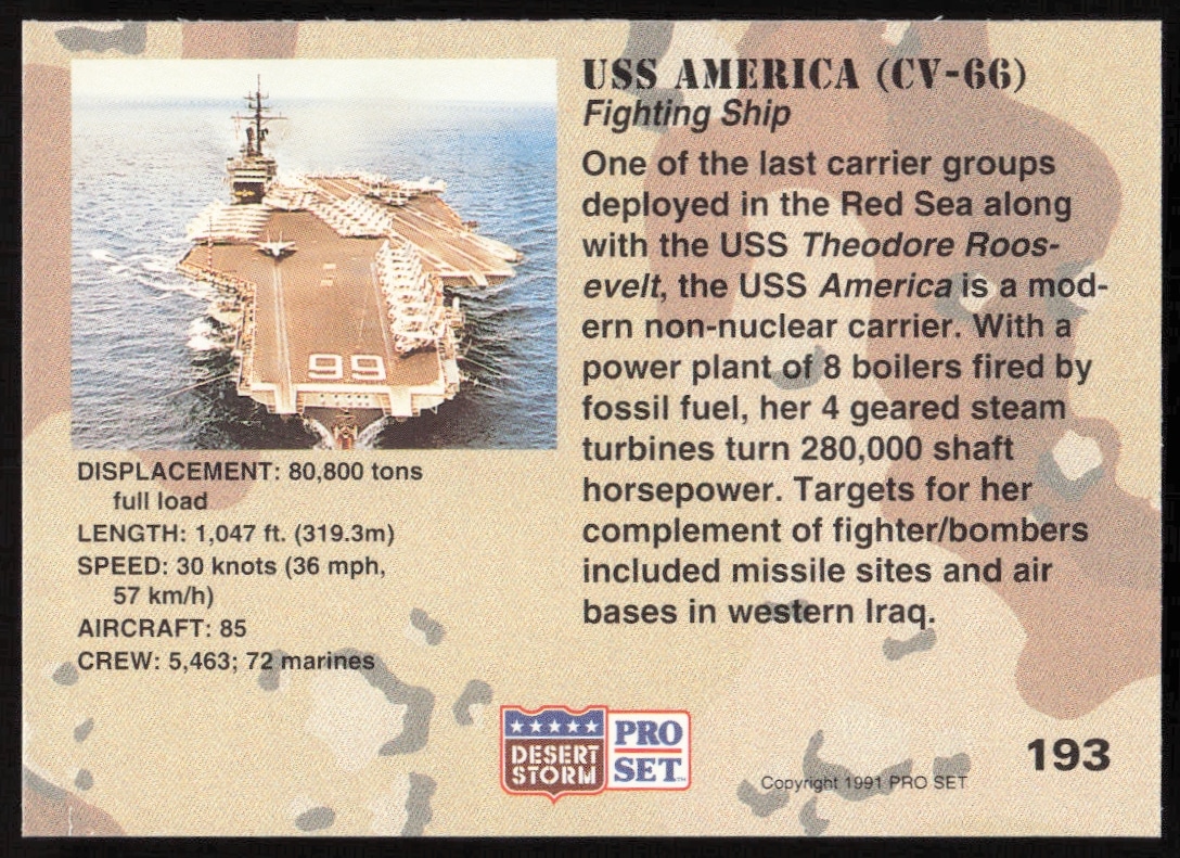 This Military card, from 1991 is part of the Pro Set Desert Storm card set. USS America (CV-66) is featured and has a card number of 193.