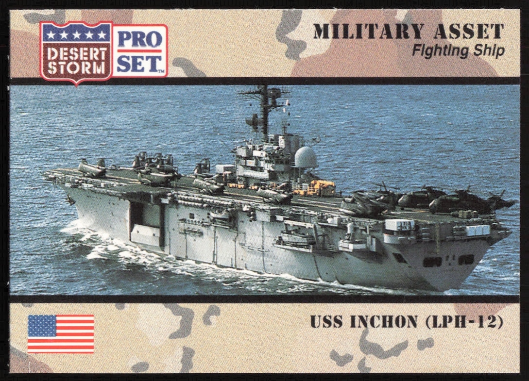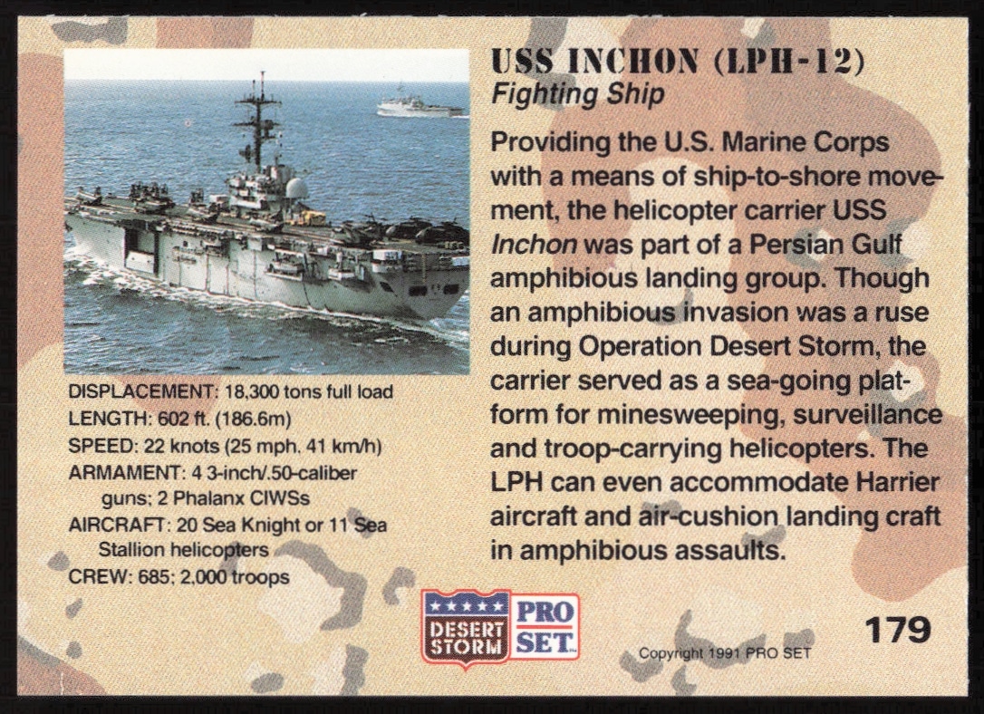 This Military card, from 1991 is part of the Pro Set Desert Storm card set. USS Inchon (LPH-12) is featured and has a card number of 179.