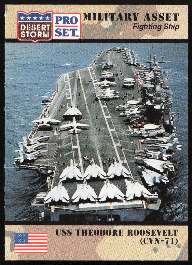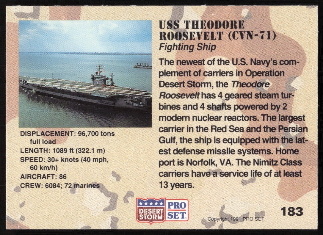 This Military card, from 1991 is part of the Pro Set Desert Storm card set. USS Theodore Roosevelt (CVN-71) is featured and has a card number of 183.