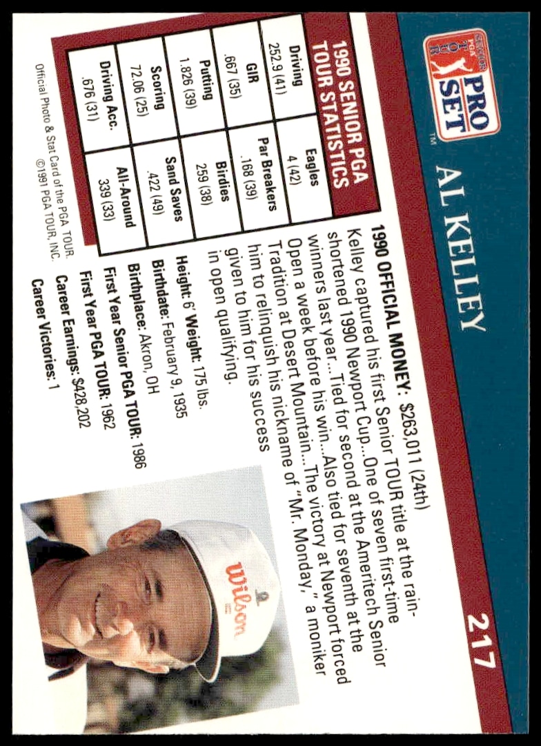 This Golf card, from 1991 is part of the Pro Set PGA Tour card set. Al Kelley is featured and has a card number of 217.