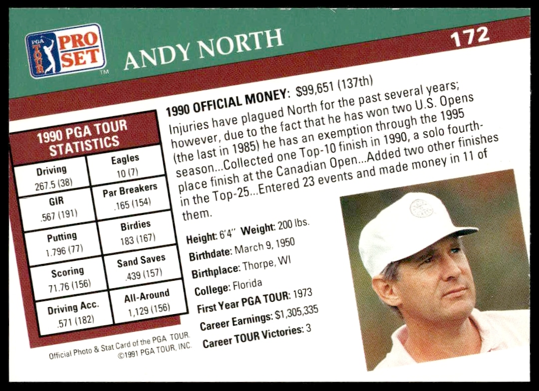This Golf card, from 1991 is part of the Pro Set PGA Tour card set. Andy North is featured and has a card number of 172.