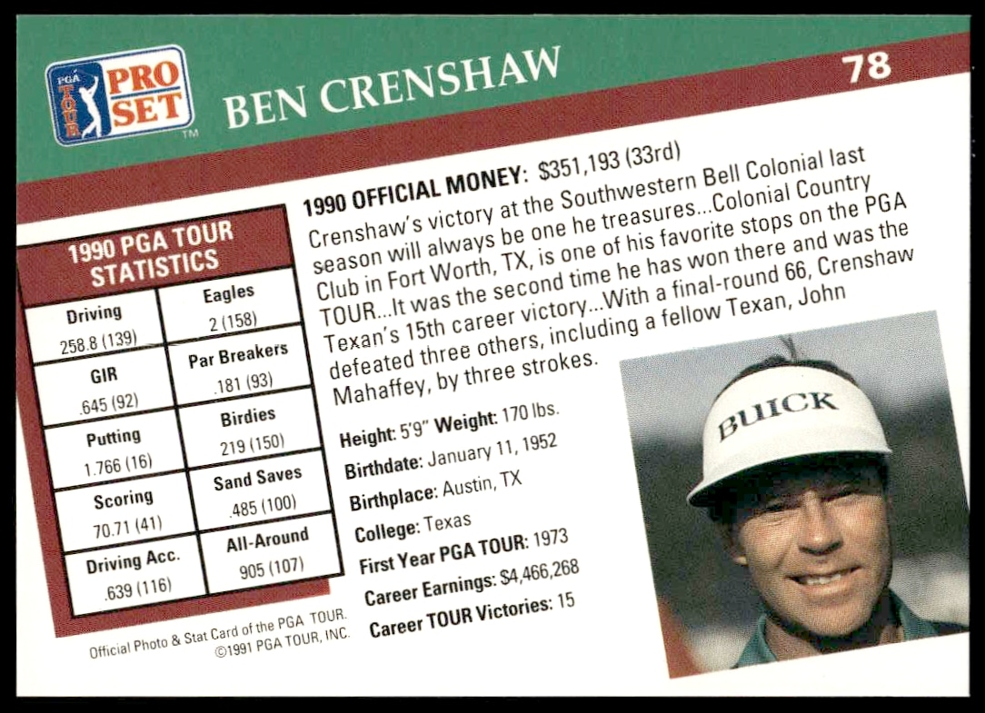 This Golf card, from 1991 is part of the Pro Set PGA Tour card set. Ben Crenshaw is featured and has a card number of 78.