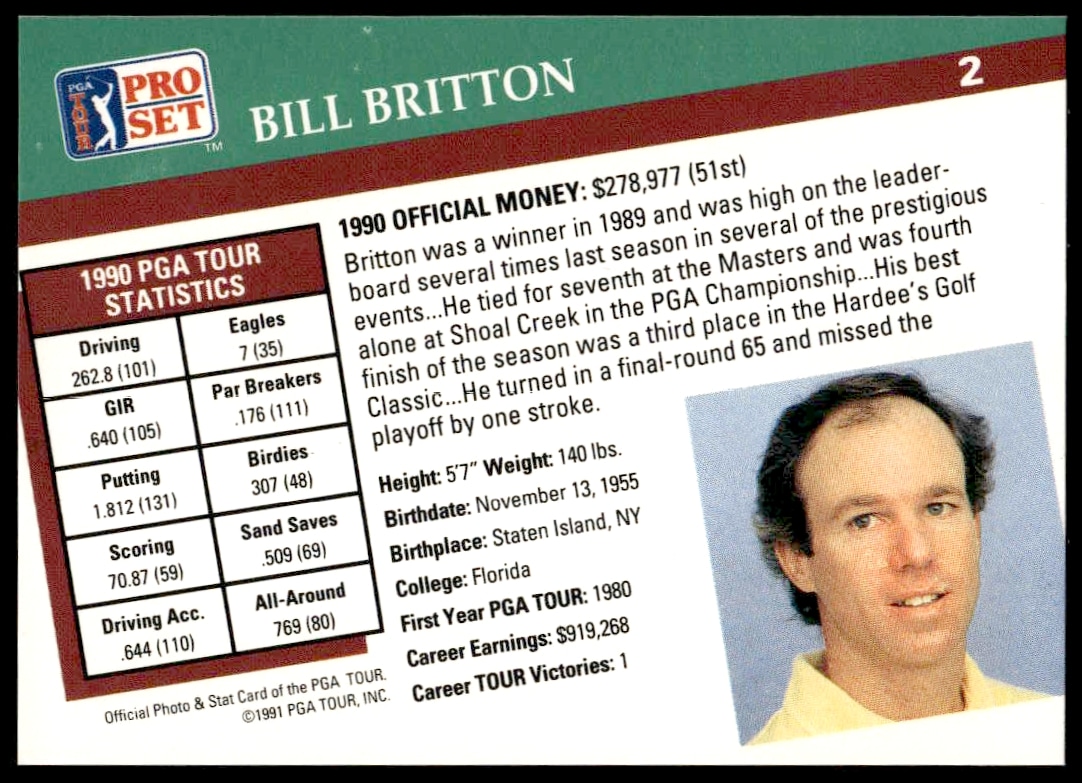 This Golf card, from 1991 is part of the Pro Set PGA Tour card set. Bill Britton is featured and has a card number of 2.