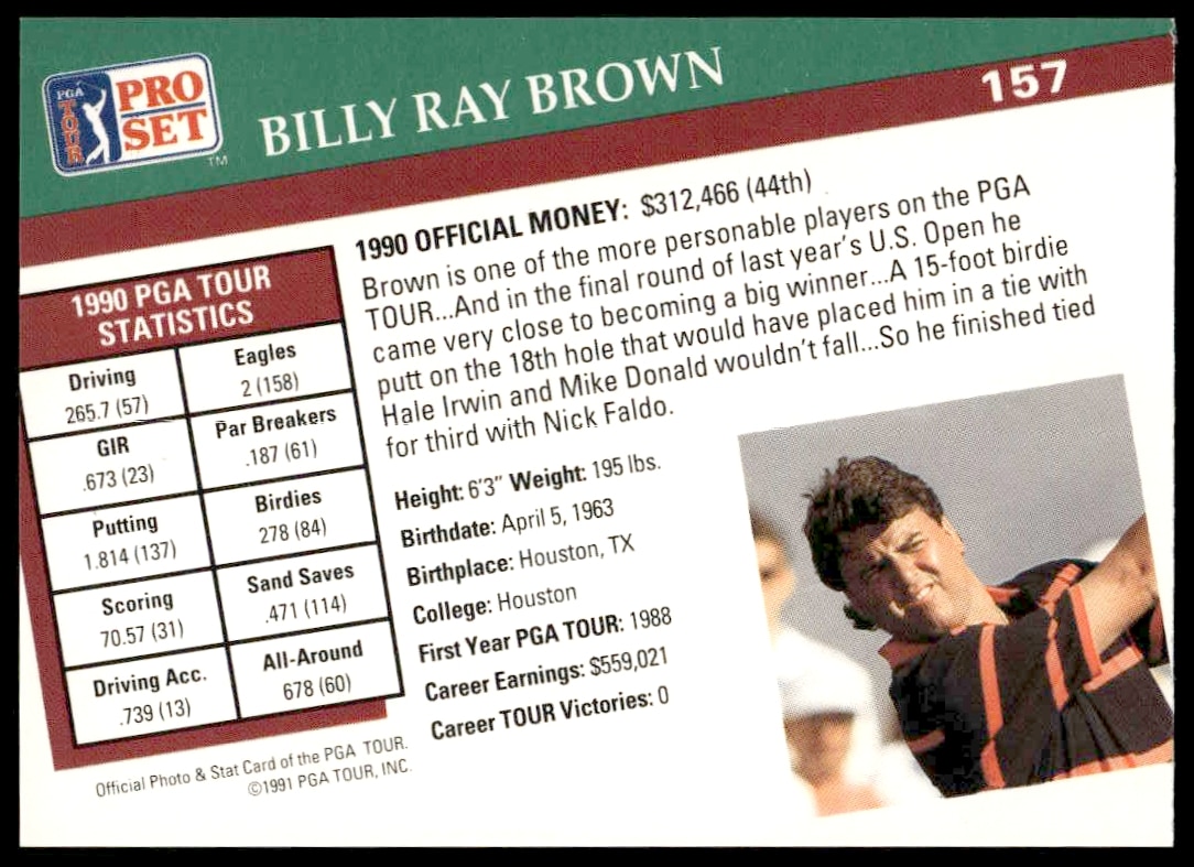 This Golf card, from 1991 is part of the Pro Set PGA Tour card set. Billy Ray Brown is featured and has a card number of 157.