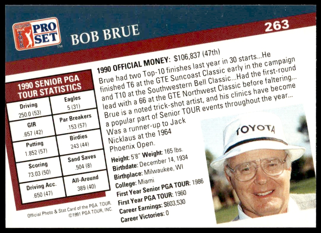 This Golf card, from 1991 is part of the Pro Set PGA Tour card set. Bob Brue is featured and has a card number of 263.