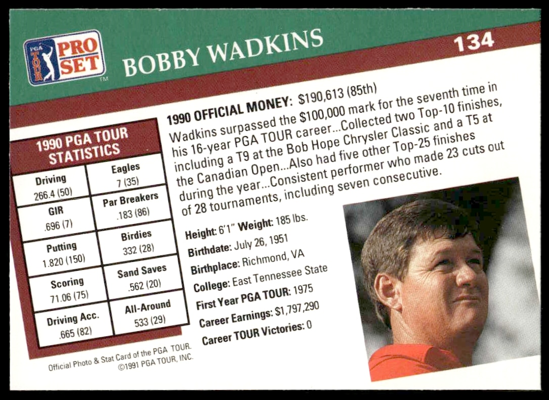 This Golf card, from 1991 is part of the Pro Set PGA Tour card set. Bobby Wadkins is featured and has a card number of 134.