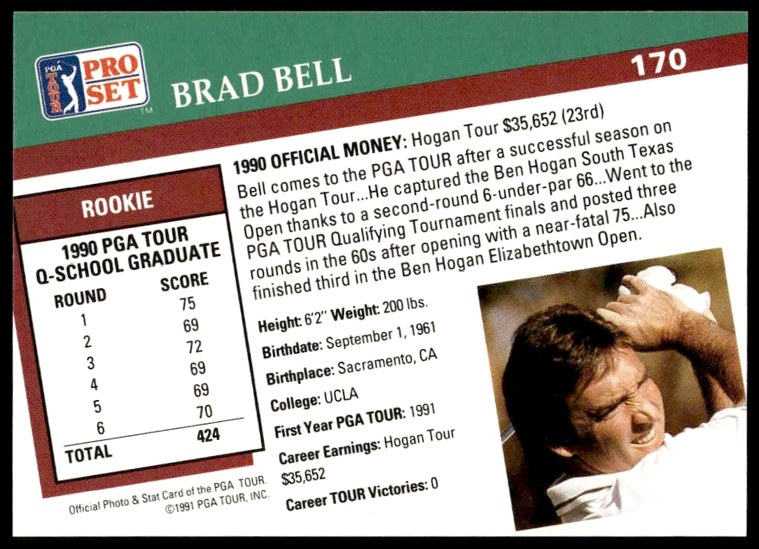 This Golf card, from 1991 is part of the Pro Set PGA Tour card set. Brad Bell is featured and has a card number of 170.
