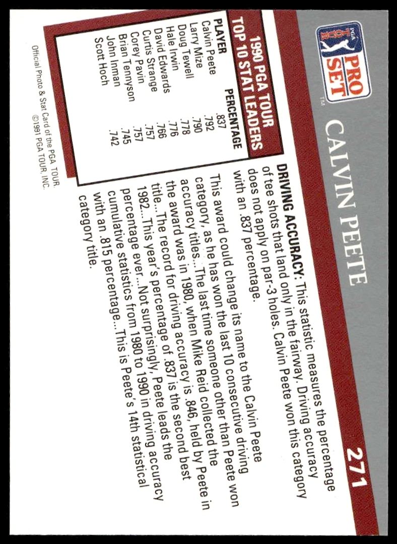 This Golf card, from 1991 is part of the Pro Set PGA Tour card set. Calvin Peete is featured and has a card number of 271.