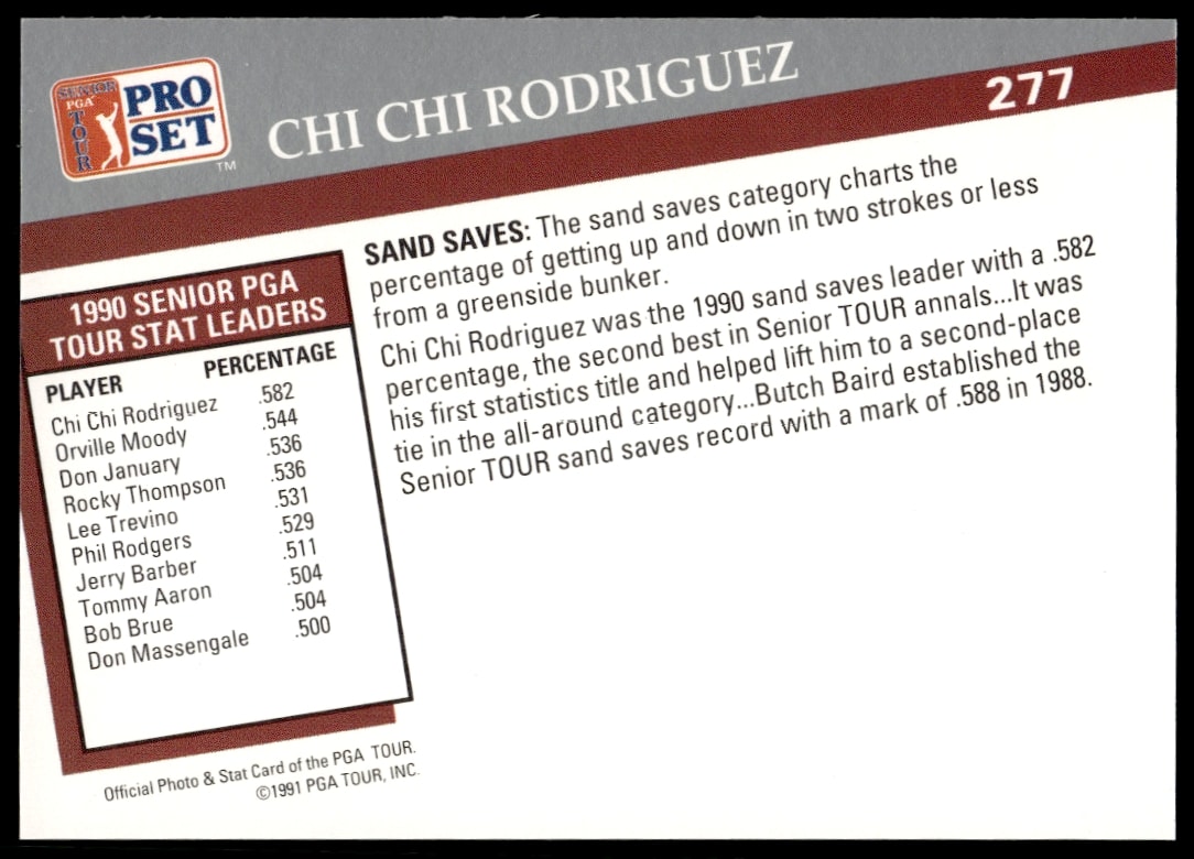 This Golf card, from 1991 is part of the Pro Set PGA Tour card set. Chi Chi Rodriguez is featured and has a card number of 277.